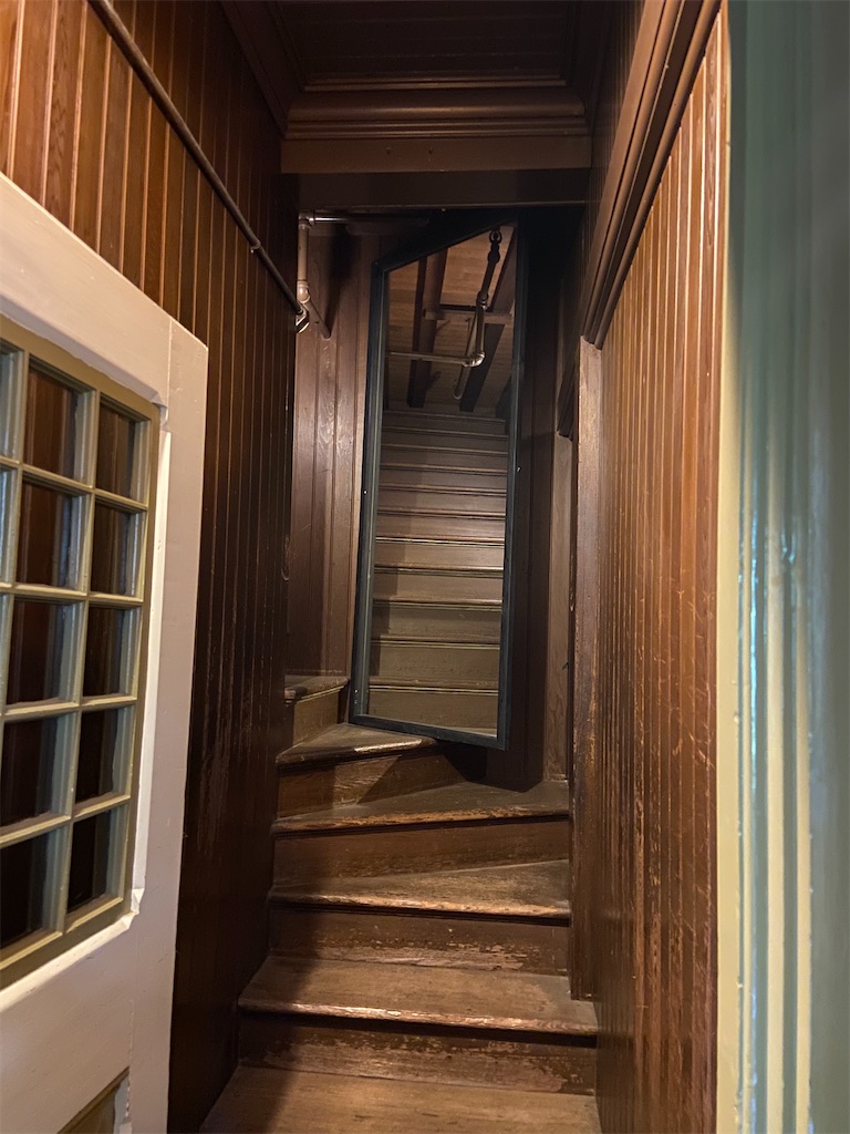 上へ伸びて途中で途切れる階段。霊を惑わせるための設計という説も語られる。